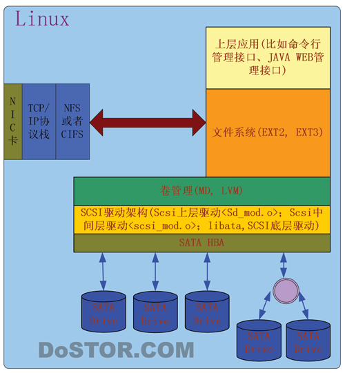 在中低端NAS领域,可以采用定制的LINUX+SATA作为平台来进行设计,如图-2所示。尽管SATA采用ATA协议集,但是在LINUX下由于SCSI驱动架构比IDE架构 (专门用于IDE硬盘) 扩展能力强,所以还让SATA跑在SCSI架构下面。