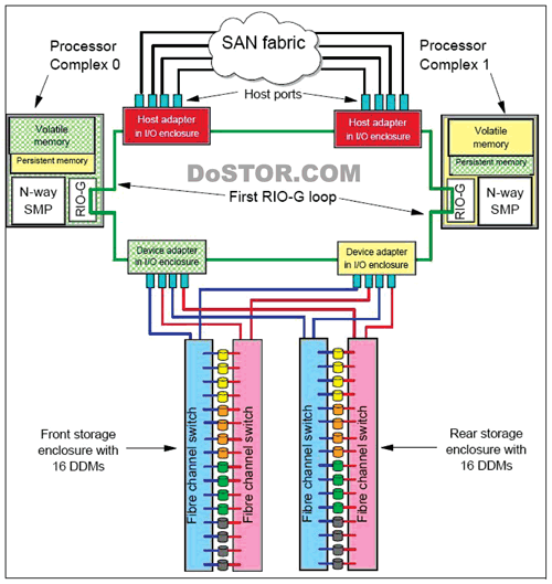 然后对照从上往下看,先是接入SAN Fabric的HBA (Host Adapter),然后数据就进入Processor Complex;经过Processor的处理,然后到达设备控制器 (Device Adapter);在DS8000内部,采用了Fabric Switch,从而设备控制器会把数据传送给光纤交换机,最终由它传递到磁盘上,注意这里的磁盘采用了双端口技术。