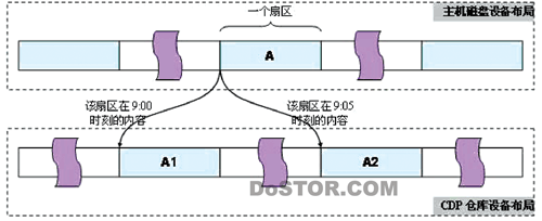 下图反映了主机磁盘设备和CDP仓库设备之间的关系。CDP仓库设备中按时间顺序保存了对主机磁盘设备的数据修改。A为主机磁盘设备上的一个扇区,该扇区在9:00和9:05分别进行了修改,它在CDP仓库设备中对应的扇区分别为A1和A2。