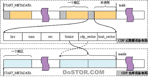CDP代码对机磁盘设备在任意时刻所作的写操作都记录下来,实体数据顺序写入CDP仓库设备中,对于这些实体数据块的描述信息,则被写入到CDP元数据设备的对应扇区。