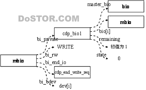 同其它块设备驱动程序的实现一样。我们从B克隆产生B0、B1和B2。然后重定向它们要处理的设备,即bi_bdev域。另外一个大的变动是重新设置了bi_end_io域,用于在I/O请求完成之后进行善后处理。
