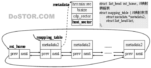 1. 顺序读取CDP元数据设备的所有扇区,构造一个从主机磁盘设备数据块到CDP仓库设备的(在这个时间点之前)更新数据块的映射。其结果保存在以mt_home为首的(映射表)链表中。