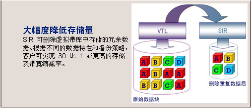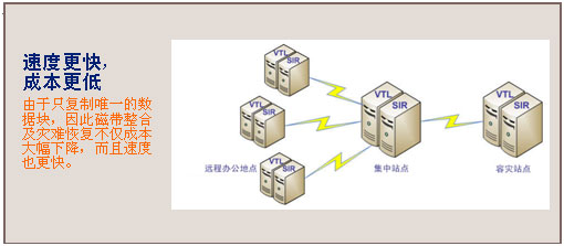 Falconstor VTL虚拟磁带库利用其单实例存储 (Single Instance Repository,SIR) 技术进行重复数据删除,大幅度降低了存储和带宽成本。
