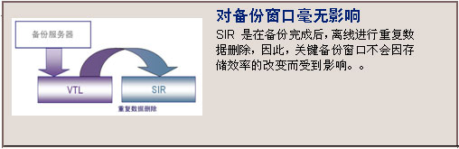 SIR 在备份完成后进行重复数据删除,因此不会降低备份速度。缩减的存储量取决于数据特性和备份策略。