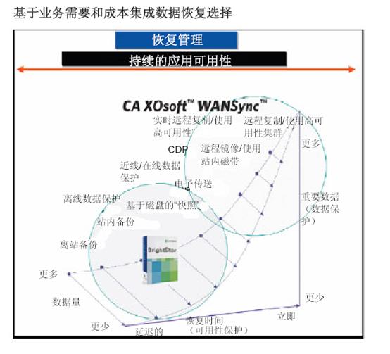 CA XOsoft包含五大产品线:WANSync灾难恢复方案、WANSyncHA高可用性方案、Enterprise Rewinder连续数据保护方案、Assured Recovery灾难恢复不间断测试方案和WANSyncCD内容分布与集成方案。CA XOsoft通过向传统的备份和恢复技术增加CDP和自动故障转移,拓宽了CA恢复管理解决方案,丰富了CA的恢复管理产品组合,这些互补技术提供了一个多层的数据保护解决方案,也加速了CA下一代信息保护平台的开发。