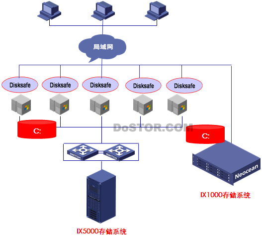 基于华为3Com的IX5000和IX1000网络存储系统,为数字林业提供了一个高安全、高效率的存储解决方案。IX5000作为在线主存储系统,最多支持8个控制器。所有应用服务器通过冗余链路连接至存储系统,保证了从应用系统到整个存储系统之间的全冗余配置。