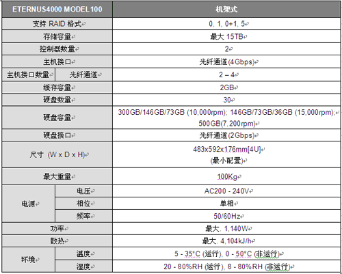 ETERNUS4000 Model100使用1.26GHz 高性能处理器,配备2GB高速缓存和4Gbps的主机通道接口。