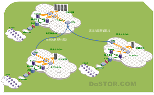 同时SVM(StoreAge Virtualization Management)本身具备IP和FC两种链路直接通过现有以太网或者光纤网络进行数据复制,无需增添FCIP路由器或者租用昂贵专线;