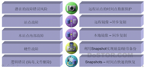 部署后StoreAge SVM的从逻辑层到物理层到站点级都为客户提供了一整套数据安全保护策略,以确保可能会发生的任何数据事故和灾难: