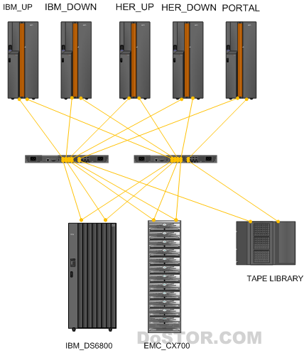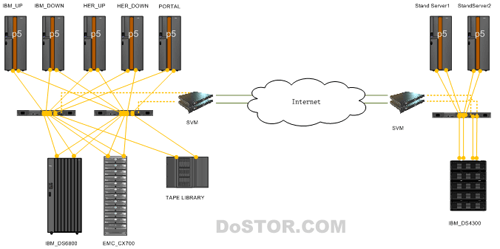 将SVM接入SAN 交换机,对当前系统中来自于不同品牌的存储EMC CX700和DS6800进行统一接管,将其聚合成一个或多个中央管理池不需要进行数据的物理转移,而且不会破坏系统中原有的任何数据;在各主机系统安装相应的Agent(其中包含MultiPath多路径软件、I/O Mapping、与SVM通讯等功能)。