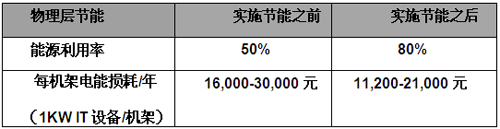 从上表我们可以看出,在物理层采取节能措施之后,将会减少30%的能源浪费,而每个机架的成本也将降低4,800到9,000元。
