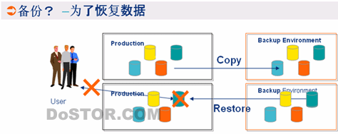 传统的备份恢复,就是将生产系统的数据复制一份到备用环境。备份数据是离线的,当然生产系统出问题的时候,再从备份系统把数据恢复过来。备份环境可能是磁带、光盘。典型的方式是用磁带,因为它很便宜,而且大量软件都支持磁带备份。磁带取出来之后,经常要把它运到跟机房不同的地方保管。