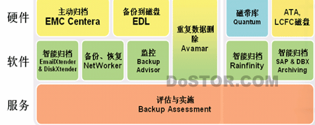 2. 主动归档设备和软件。EMC归档软件不仅让能够设定规则,让信息在适当的时间自从生产系统归档,而且还能让磁盘阵列进行自我管理、自我修复,实现数据的有效保护。