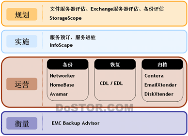 EMC BuRA是在对客户需求进行充分评估之后,提供的全面备份恢复解决方案,它的目标是,从硬件、软件和服务三个方面,从规划、实施、运营、衡量四个环节,为用户带来真正的价值。新一代BuRA发扬光大了这种思路。如图所示。