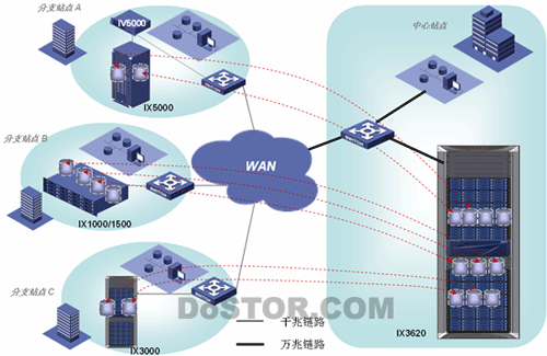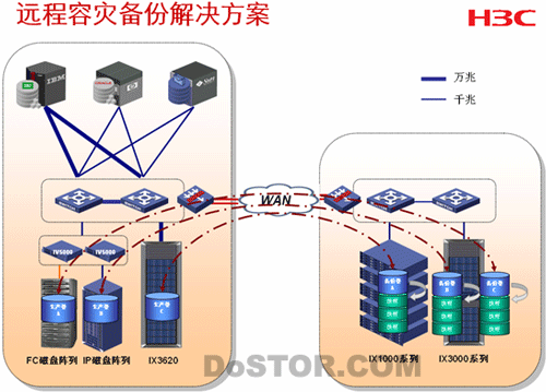 下面是VOD点播的方案,通过存储和存储之间的智能复制的能力,可以构建一个由中心接点和多个边缘节点这样一个面向内容分发的网络提供一个大型的VOD的网络解决方案。为什么是大型呢?在大的访问量的情况下,无论是全部集中在中心还是全部分散在边缘,都会面临网络服务器成为最大的压力,通过两级的级联的结构可以非常好的解决这个问题。这称之为WSAN。但是城域网站在很长时间一直以来停留在局域,我们什么时候看到过FC拉出来或者拉到跨省,这是不可能实现的。有了IP技术,最大的好处是在于可以使分布在只要IP可达,数据就可达,你的管理手段也可达,这是远程备份的解决方案。方案最大的特点是虚拟化各种各样不同的现有的存储厂家的产品,进行统一管理,这是虚拟化的解决方案,也就是磁盘对磁盘的备份的解决方案。