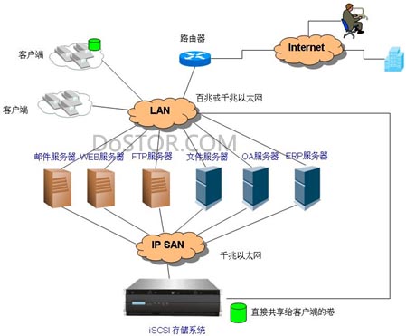 7) 共享灵活性强。iSCSI存储由于传输基于IP网络,所以可以将它直接接入LAN中,并且可以将存储容量共享给桌面用户,更加集中化数据管理,使得桌面用户不在受限于本地存储的容量,而且可以支持更多的应用,比如桌面计算机的数据集中化和备份;