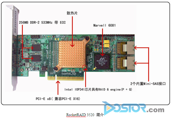 DoSTOR存储在线 11月20日国内报道:RocketRAID 3520 是HighPoint最新推出的一款PCI-E X8的IOP产品,有两个内置MINI-SAS接口,可以连接8块SATA II磁盘(兼容SATA一代磁盘),此款产品是HighPoint针对中、高端存储市场需求开发推出;RocketRAID 3520采用Intel架构的IOP341处理器,以绝对的运算优势超越同等八盘位RAID卡,使RAID6、RAID5有各自单独的处理单元,大幅度提升写性能,可适用于非编存储系统,硬盘备份,NAS存储系统,视频编辑和近线存储系统等。