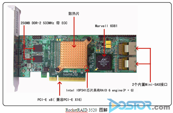 DoSTOR存储新闻 11月20日国内报道:HighPoint 最近推出一款 RocketRAID 3520, 它是HighPoint 公司IOP家族的最新成员。RocetRAID 3520 采用 IOP 341 的处理器,并且支持RAID 6 engine (P + Q)。RocketRAID 3520 内部带有2个Mini-SAS 接口,通过数据线可以支持8块SATA 硬盘。RockatRAID 3520硬件磁盘阵列卡提供超高的传输效能,且具有强大的容错能力,同时配合完整的磁盘阵列管理功能,是目前成熟的存储解决方案。