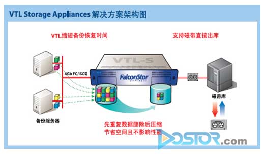 DoSTOR存储在线 12月7日国际报道:飞康VTL存储管理器(VTL-S)是整合业界领先的VTL虚拟磁带库和重复数据删除技术的革命性数据保护解决方案,可以在不改变现有备份环境及管理策略的前提下,大幅提升备份恢复的速度及可靠性。备份后自动删除重复数据,平均可节省30倍存储空间;通过全域重复数据删除功能(Global de-duplication),在20:1的重复数据删除比率下,异地灾备的带宽需求降低达95%。
