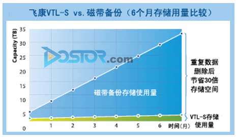 重复数据删除技术为用户带来的效益相当可观,以全备份的数据量为1TB,备份策略为增量备份,平均每周有5%(50GB)的数据变化和新增1%(10GB)数据,需要保存6个月备份的环境为例,采用一般磁带备份所需的空间约为30TB,相比之下,飞康VTL-S只需要1.1TB(配合2:1压缩),节省存储空间将近30倍,投资回报率极高。