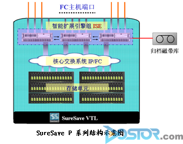 SureSave P系列产品主要由三部分组成,即:"智能扩展引擎组"、"核心交换系统"和"存储单元"。这三部分之间紧密结合构成这个产品的硬件平台,在这个平台上运行核心虚拟带库管理软件,实现虚拟磁带库的各种功能。