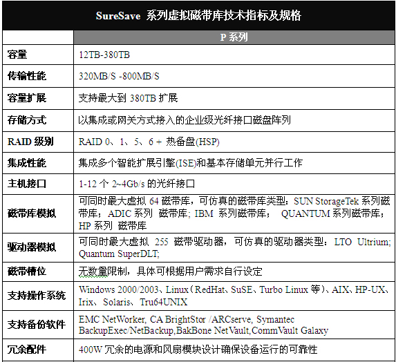 我们在这里将详细介绍SureSave虚拟磁带库P系列产品的详细技术指标,供大家参考,让您能够充分了解这款产品的优越性能。