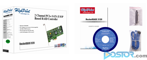 首先,从RocketRAID 3120的外包装来看,除了控制卡本身外还附带了说明书和CD驱动,此外还包括了1个低档板和2根SATA数据线。