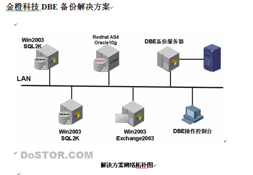 采用金橙科技DBE存储备份软件,硬件采用H3C的iSCSI磁盘陈列作为备份数据存储,使用一台单独的机器安装DBE备份服务器及备份介质管理软件,分别在需要备份数据的服务器上安装DBE备份软件备份客户端及DBE应用系统备份代理模块,在一台普通的PC机上安装DBE操作控制台。