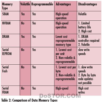 针对非易失性存储器要求,串行EEPROM器件支持I2C、SPI或微线(Microwire)通讯总线,而串行闪存通常使用SPI总线。由于写入速度很快且带有I2C和SPI串行接口,FRAM在一些系统中得到应用。表2比较了各类数据存储器的优缺点。