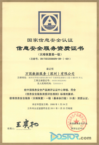 如何帮助用户甄选优质、专业的服务提供商?如何规范和引导新兴的灾难恢复与业务连续性管理行业的健康发展?如何建立科学、完善的灾难恢复服务能力体系?一直是相关政府职能机构考虑的"头等大事"。为此,中国信息安全产品测评认证中心在近期推出了信息安全服务资质(灾难恢复类)认证,并经过严格审核后,将国内第一份"信息安全服务资质证书(灾难恢复类一级)"(注册号:CNITSEC2008SRV-DR-I-001)颁发给GDS万国数据服务有限公司(以下简称GDS万国数据)。