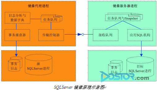 SQLServer数据库镜像引擎包括代理、镜像服务器、基准装载器三大部件。代理包含事务日志实时捕获器、事务日志分析器、自适应数据字典、初步过滤器、传输控制器和任务队列等;镜像服务器包含接收队列、事务队列和Snapshot存储、SQL应用机构等。如下图