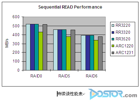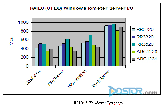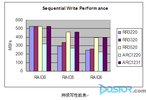 从以上性能对比图中,主要以RocketRAID 3520对比Areca1220/Areca1231/RocketRAID3320/3220可以看出在各个级别的性能测试中,RocketRAID 3520可以很优秀的体现性能,尤其是在各在个服务器项目的测试中,更是让各大行业客户所青睐,要比同比的产品高15%左右;鉴于非编行业的性质,实际应用中以RAID5为多,在这里只提供了RAID5的性能对比数据,其实在RocketRAID 3520 IO处理器中还有一个单独的RAID6处理单元,所以在RAID6性能中更是可以体现性能极佳的优越性。