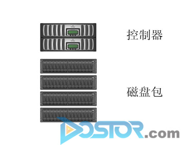 电源(热插拔)。14个/18/36/72/144/300GB磁盘(热插拔)。双ESH2或ESH4(失效自动切换)。控制单元(监控和诊断)。多个磁盘包可以连接在一个机头上,容量从表面上1TB到64TB。可以在线增加磁盘包。