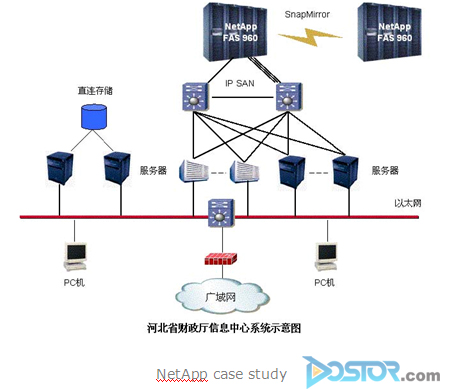 河北财政厅业务系统将采用NearStore 存储产品在2 期在异地建设一个容灾中心,通过SnapMirror 软件实现远程容灾。