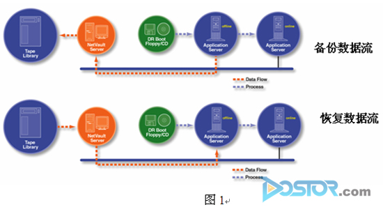 采用公用的一张光盘,所有的系统都采用这一张光盘。这个光盘可以启动系统,同时可以启动网络,然后备份服务器将备份在磁带库(或者虚拟带库)中的整个硬盘内容或者第一主分区内容恢复到灾难机。这样不论灾难机原来有多大容量数据,都可以存放在整个备份系统的备份设备中,统一进行管理,而且不需要经常刻光盘,也就是说光盘不需要经常更新。比较典型的代表是BakBone NetVault VaultDR。图1是BakBoneNetVault VaultDR灾难备份和恢复的数据流,所有系统采用统一的光盘进行。