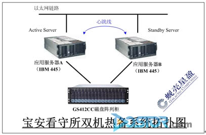 由星盈科技主持搭建的双机热备看守所信息管理存储系统把原先闲置的IBM445服务器也充分地利用起来,两台服务器通过利用星盈提供的双机软件,组成双机热备系统。一台服务器为工作机(Primary Server),另一台服务器为备份机(Standby Server),在系统正常情况下,工作机为信息系统提供支持,备份机监视工作机的运行情况(工作机也同时监视备份机是否正常,有时备份机因某种原因出现异常,工作机可尽早通知系统管理工作人员解决,确保下一次切换的可靠性)。当工作机出现异常,不能支持信息系统运营时,备份机主动接管(Take Over)工作机的工作,继续支持信息的运营,从而保证信息系统能够不间断地运行(Non-Stop)。当工作机经过维修恢复正常后,系统管理人员以人工或自动的方式将备份机的工作切换回工作机;也可以启动监视程序,监视备份机的运行情况,此时,原来的备份机就成了工作机,而原来的工作机就成了备份机。