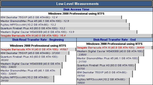 从上面的WB99测试结果来看,希捷的此款酷鱼三代硬盘的 Outer-Zone 数据传输率达到了 40.5MB/s,这超过了IBM 公司的“玻璃之星”(Deskstar 75GXP),而摘走“最快IDE硬盘”的桂冠。在 Inner-zone 传输率上,它也达到了 26.4MB/s,这也是我们见过得最快的硬盘。