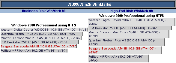 虽然酷鱼三代的数据传输率非常高,是此六款硬盘中最快得,但这并不能为其带来很高的磁盘性能。在WinBench99 的“普通商业应用磁盘性能测试”及“高端磁盘应用性能测试”中表现均不佳,分别落后于位于第一的西数WD400BB硬盘11%及15%。看来,硬盘最快并不代表就是性能最好。