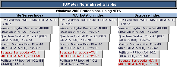 在 IOMeter 性能测试中,酷鱼三代硬盘的表现令人担忧,在 Workstation Index测试中,它比昆腾高能火球四代落后了近16%,而位于第一的IBM Deskstar 75GXP比酷鱼三代硬盘领先了近24%