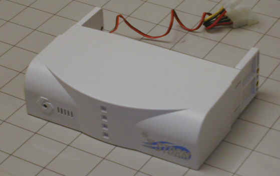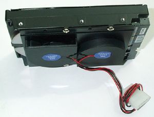 我们安装此款冷却器时,要先将硬盘取下来,然后将硬盘安装在冷却器的安装架上。具体的做法是将硬盘拆下,放置在冷却器内部的方形空间内,然后将冷却器固定在5.25英寸驱动器的间隔处。安装完成后通上电源就可以开始工作了。整个安装过程所需时间不超过15分钟。