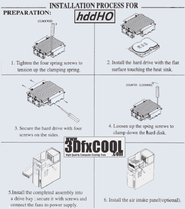 下面的这几张图片是从冷却器的产品包装上扫描下来的,他们可以让你非常清楚的了解安装的细节,还可以清楚告诉你这个硬盘冷却装置是如何工作的。