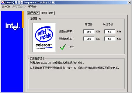 现在笔者所使用的是3.70版,当然更新的版本会加入最新的处理器识别数据。启动该软件后出现在大家面前的是频率测试页(如图二),它会告诉你,正在使用的处理器的真正主频,也就是图中预期的频率项。现在笔者使用的是Intel Celeron II 566MHz的处理器,所以其处理器(主频)频率为566MHz,系统总线频率为66MHz。报告的频率一项,也就是目前处理器真实的运行速度。简单的来讲就是预期的频率和报告的频率项中所显示的数值如果完全相同,就证明这颗处理器是正品。正如你所看到的,在处理器系列标志旁边有一个绿色的小钩和通过两个字,所以可以完全放心,这颗处理器是绝对的正品。