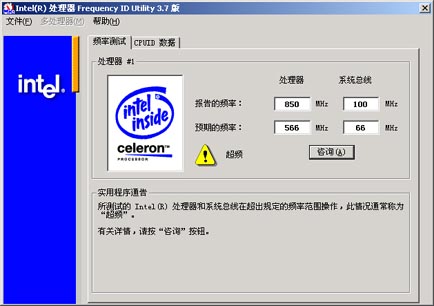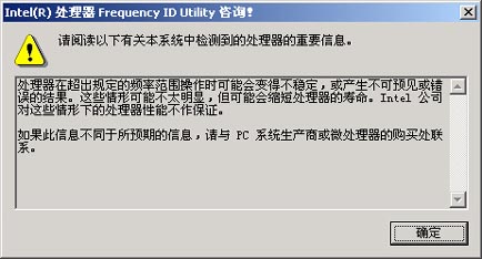 那检测到不是正品的处理器时会是什么样的呢?我们下面就来看看当检测到非正品或超频后的处理器时所显示的状况。请看图四,在图中预期的频率中的值与报告的频率项中的值完全不符。而且在处理器系列图标旁边出现了一个叹号和超频的字样。这就说明你现在使用的这颗处理器是非正品或已超频的处理器。当然你还可以通过咨询按钮获得更多这方面的讯息(如图五)。