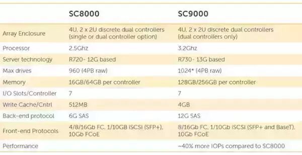 相比之前的SC8000来看,戴尔SC9000也是一个4U的设计,在性能和扩展性方面有了增强,最多支持1024块HDD盘,但在最大容量上和SC8000一样也是4PB。SC9000阵列采用的只是双控制器设计,而SC8000对于用户来说可以选择单控制器,也可以选择双控制器。SC9000的Cache容量每节点可以配置到128GB或256GB,之前SC8000为16GB或64GB。
