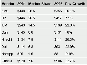 DoSTOR存储分析 9月7日消息:根据IDC最新的市场调查数据显示,在上个季度中网络存储收益的增长数率超过了磁盘存储整体数率三倍。而根据季度磁盘追踪指数,IDC认为2004年第二季度全世界网络存储的收入在21亿美金左右,是有史以来第二高的季度。2003年第四季度网络存储的收入在21.5亿美元,而今年第一季度下滑到了19.8亿美元。