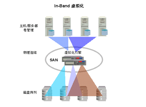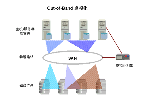 SVC是一款对称方式(in-band)虚拟化存储软件,可运行于Linux平台设备或思科MDS 9000交换机上。相较之下,EMC的存储路由器则是不对称方式(out-of-band)虚拟化存储形式,与来自博科(Brocade)、思科(Cisco)以及McDATA等公司的智能交换机相连接使用。HDS则是在它9月份发布的Tagmastore通用存储平台上,采用控制器来实现存储虚拟化。