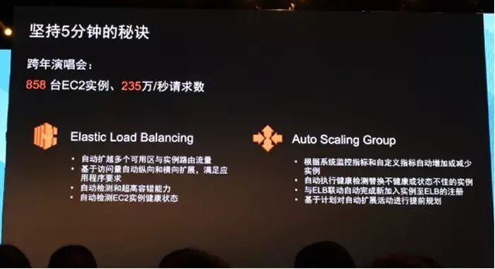 在AWS高峰论坛上,Musiccal.ly、芒果TV等用户分享了AWS公有云的应用经验。其中,Musiccal.ly App在AppleStore音乐视频下载排名中位列第一,其全球注册用户数达到1.2亿,每日播放20亿+的视频。Musiccal.ly完成构建AWS公有云基础上,AWS基础设施能力满足了Musiccal.ly社区业务发展的需要。而芒果TV,在2015-2016湖南卫视跨年演唱会期间, 20分钟内弹幕(ELB)突增了185倍,879万实时互动弹幕刷屏。借助AWS Elastic load Balancing和Auto Scaling Group的支持,芒果TV临时开启了858台EC2实例,顺利应对了业务尖峰,实测结果显示:业务请求数据高达235万/秒。若采用传统手段,满足这样的业务压力几乎是没有办法想象的。