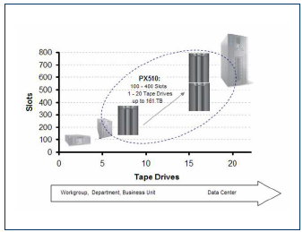 2005年5月,昆腾公司推出了数据中心级磁带库PX510。这是昆腾定位中端自动化细分市场后,专门推出的对应的产品。随着PX510的推出,Quantum为客户提供最广泛的备份、恢复和归档系统,可用作灵活构建模块优化存储资源。相比昆腾的旗舰产品PX720企业级磁带库来说,PX510不仅在可靠性、高可用性、可扩展性及功能性可以与之媲美。而且,PX720是独立式系统,而PX510封装在18U机架式外形规格中。PX510磁带库在昆腾现有的磁带自动化投资组合产品的定位介于PX720(它在单一框架中提供720个磁带插槽,有5个框架可供扩展)和M2500磁带库(有100个插槽,模块化)的之间。