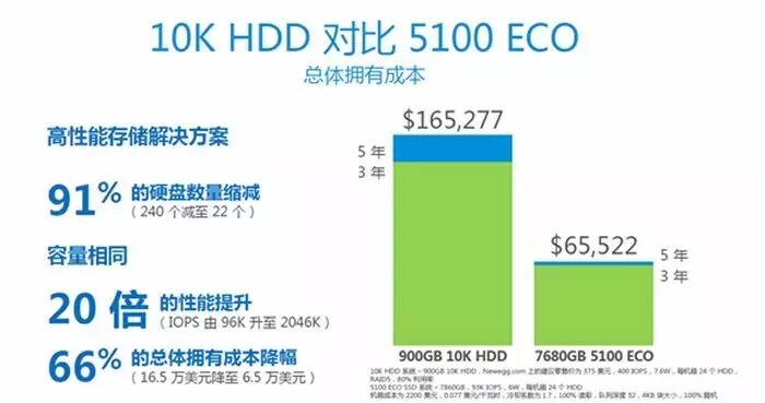 美光5100较之高端磁盘,如10K HDD优势明显,从性能上,IOPS有20倍的性能提升,可以从96K提高到2046K,22个美光5100 SATA SSD可以发挥240个HDD的作用,可以减少91% 的硬盘数量。绿色节能、TCO则更是美光5100的强项。
