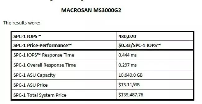对于行业用户来说,如果MS3000G2的性能和容量可以满足需要,从性价比的角度,这将是最好的选择。在此需要注意的是,此次SPC-1测试还不是MS3000G2的顶级配置的表现,此次只采用了4个控制器,它可以通过横向扩展到16个控制器,也就是规模4倍的提升;另外,控制器的内存也可以从64GB提高到128GB。如此,相信MS3000G2会有更好的SPC-1测试表现。